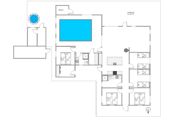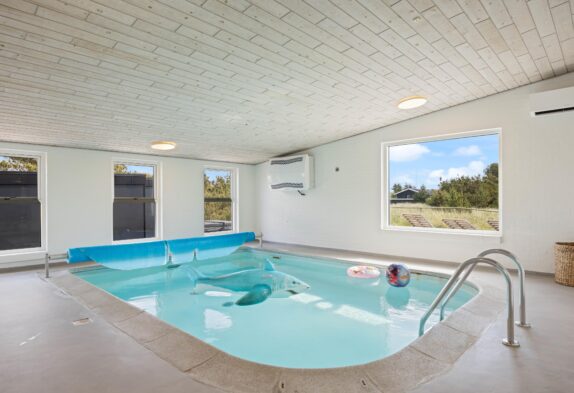 Der er vist ingen tvivl om, at den lækre swimmingpool er noget af det allerbedste ved dette sommerhus. Her er virkelig de bedste rammer for alle typer vandhunde. Både dem, der fortrækker varme bobler, og dem, der foretrækker at svømme lange baner og kaste med badebolde. Swimmingpoolen indbyder i den grad til leg og vandplaskeri, og rummet er ganske uimodståelig for vandhunde med hang til fart og sommerfugle i maven. Den er opvarmet og klar når I kommer. Det er også en ekstra skøn forkælelse efter en lang dag ved Vesterhavet. Vandværdierne i saltvandspoolen bliver elektronisk overvåget 24 timer i døgnet, så vandkvaliteten altid er helt i top. Der er svømmetræner i poolen og spaen fyldes op med vand fra poolen.