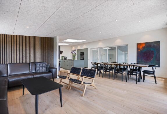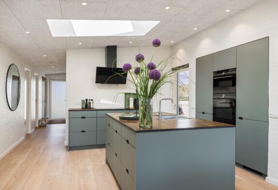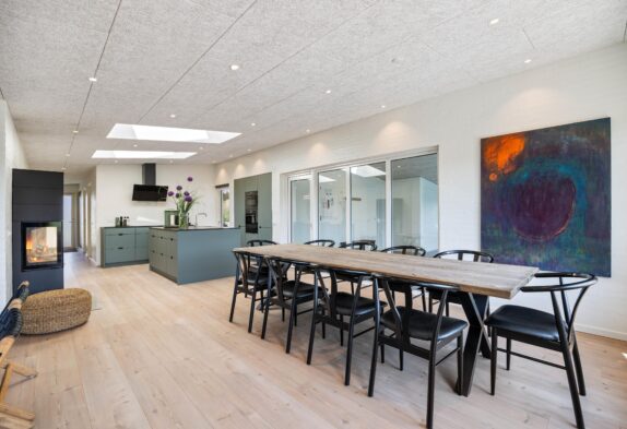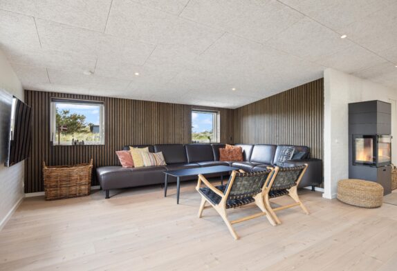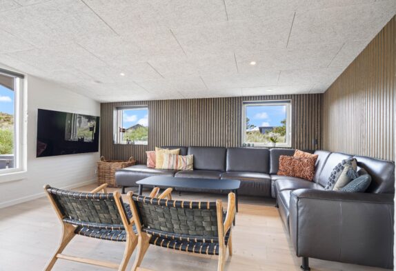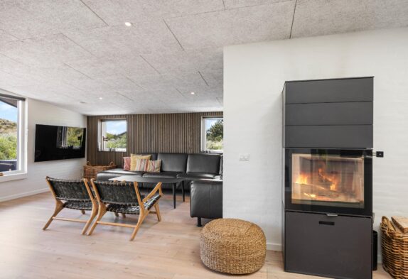 Det 192 kvadratmeter store sommerhus byder jer straks velkommen med dets lyse farver, store rum og lyse vinduespartier, der inviterer solens stråler og de omkringliggende naturskønne omgivelser indenfor. Det store køkkenalrum er det naturlige centrum, hvorfra jeres aktiviteter kan foregå. Stuen er indrettet med gode og behagelige møbler, som man straks får lyst til at dejse ned i med en god bog. I denne afdeling står husets skønne brændeovn, der både udsender hygge- og varmebølger. Her finder I også et fladskærms-tv – Der er desuden TV på alle værelserne, og så er der naturligvis trådløst internet i hele sommerhuset, så alle kan følge med i verden udenfor den lille oase.