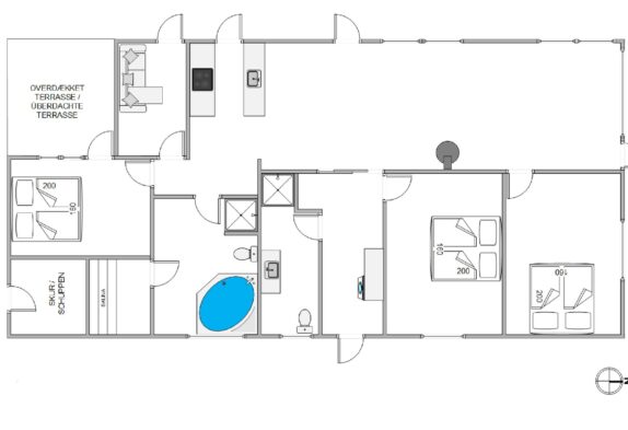 Sommerhuset byder på 3 gode værelser med dobbeltseng samt 1 værelse med sovesofa, hvor børnene rigtig kan hygge sig. Derudover har huset 2 skønne badeværelser med bruseniche og gulvvarme. I skal derfor ikke bekymre jer om kø til toilettet om morgenen. Det ene badeværelse har tilmed en wellnessafdeling med både spabad og sauna. Et indslag, der helt sikkert vil vække begejstring hos alle i familien og blive en del af jeres rutiner under opholdet.