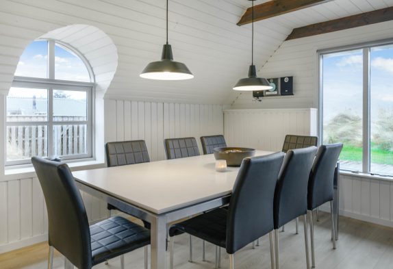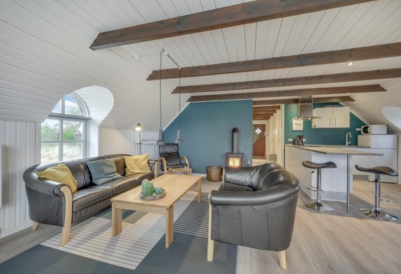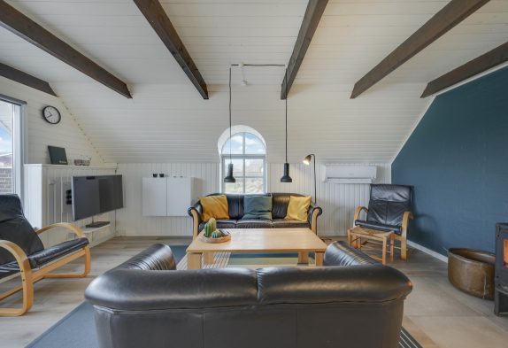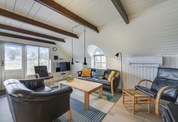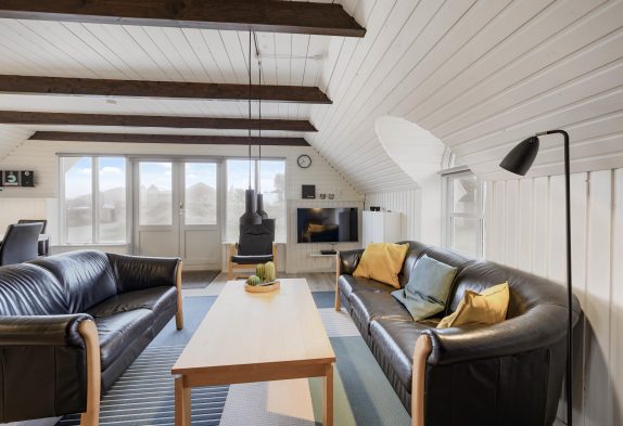 Alrummet er indrettet med gode, komfortable sofaer og lænestole, som I kan sætte jer til rette i og slappe fuldstændig af foran fjernsynet. For ekstra hygge og varme kan I tænde op i brændeovnen, der fuldender den hyggelige sommerhusstemning.