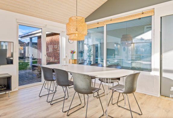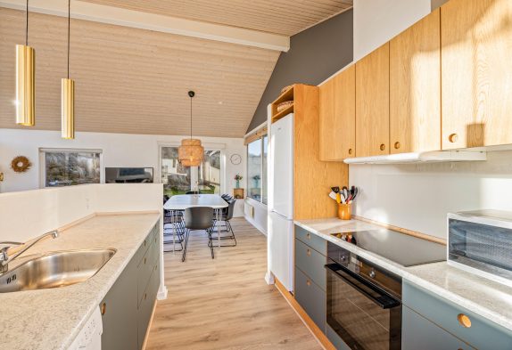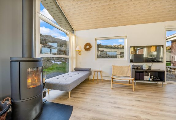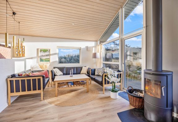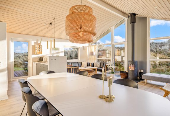 Indretningen i sommerhuset er hyggelig og lever fuldt op til den skandinaviske indretningsstil. Her er der fokus på flotte solide møbler i god kvalitet holdt i den smagfulde nordiske farvepalet af lyse, grå og sorte nuancer. Sommerhuset indeholder 4 gode værelser med hver 2 sengepladser samt 2 badeværelser. Der er derfor ingen grund til at frygte kø på badeværelset om morgenen. Køkkenet i huset er nyt fra 2022 og her er både opvaskemaskine, mikroovn samt køleskab med frostboks. De store vinduer i husets gavl inviterer både lys og det omkringliggende vestjyske landskab indenfor. Og det er noget nær umuligt ikke at blive henført af den smukke natur udenfor, hvor det kuperede klitlandskab og de majestætisk knejsende græsser udgør scenariet. Denne udsigt kan også nydes på den store terrasse, der er som skabt til hyggelige stunder med bøffer på grillen eller solbadning.