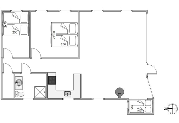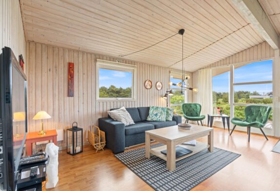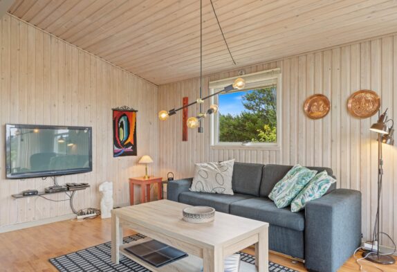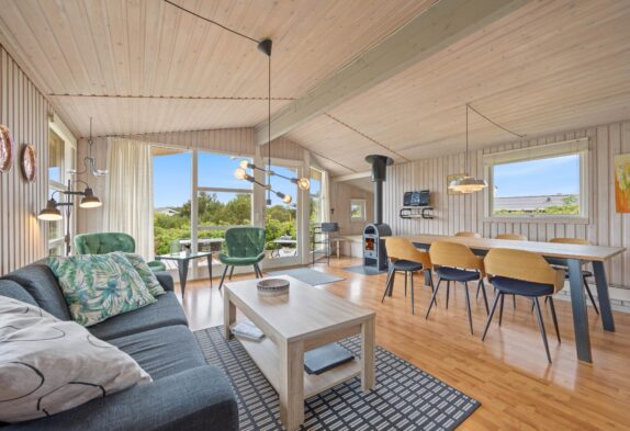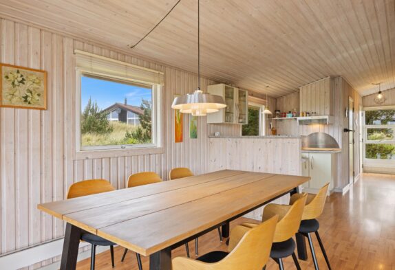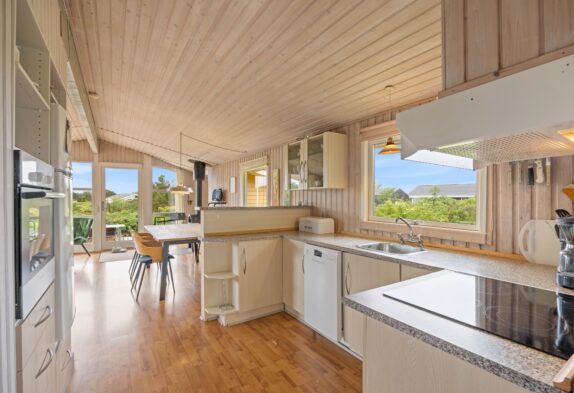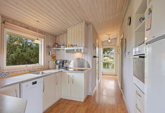 Dette sommerhus emmer af en afslappende sommerhusstemning, hvor hele familien straks vil føle sig hjemme. Den hyggelige lyse stue er kombineret med køkkenet, og det er her hele familien kan samles, og hvor I med garanti kan få nogle hyggelige stunder sammen. Hvad end det er med et spil i stuen, en god middag ved spisebordet eller fælles madlavning i det gode køkken.