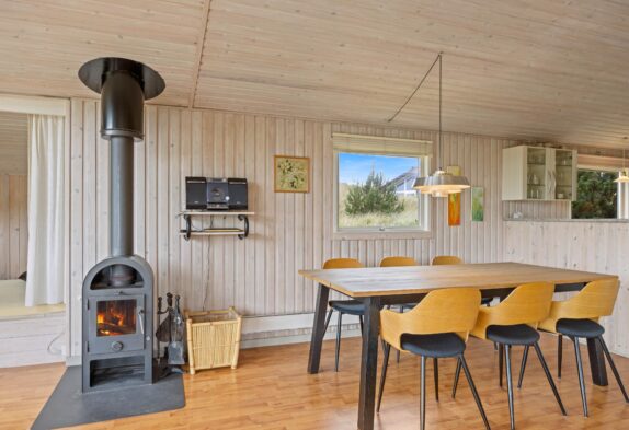 Sommerhuset kommer med flere hyggekroge inde såvel som ude. I køkkenalrummet finder I en hyggelig alkove, hvor det er oplagt at børnene bygger hele, eller I måske snupper jer en morfor – Det er jo ferie! I kan med fordel også vælge at tænde op I husets brændeovn, og bare stille og roligt mærke al den varme og hygge som den kan sprede.