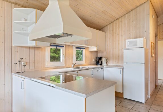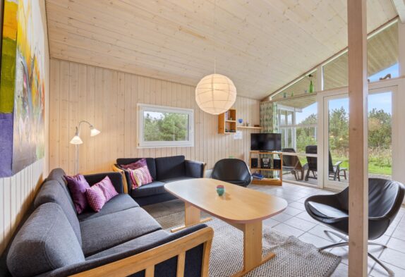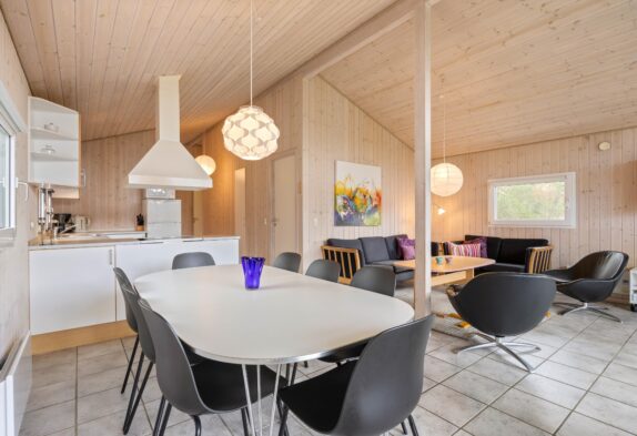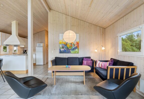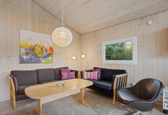 Den lyse og hyggelige stemning er gennemgående for sommerhuset. Der hersker på flere måder en vaskeægte sommerhusidyl i huset, hvilket blandt andet kan tilskrives de lyse panelvægge, den åbne planløsning og de store åbne rum. Samtidig er indretningen hyggelig og enkel, og I vil uden tvivl hurtigt kunne føle jer hjemme i huset.