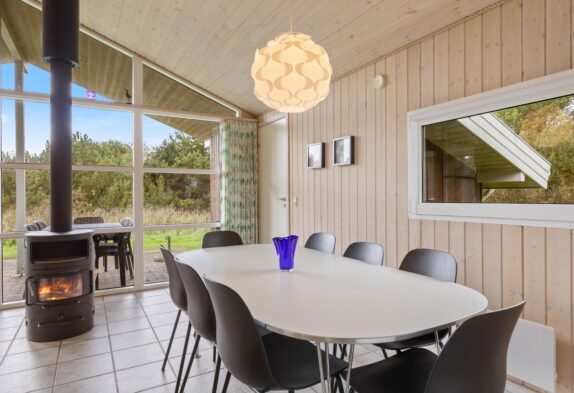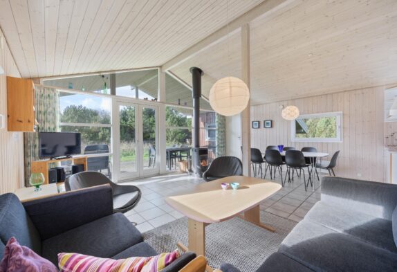 Stemningen i sommerhuset på Lodbjerg Hede er lys og imødekommende grundet de store vinduespartier, der udgør den ene ende af husets gavl. Gennem vinduerne kan I nyde den smukke natur udenfor, mens I lytter til ildens knitren i brændeovnen.