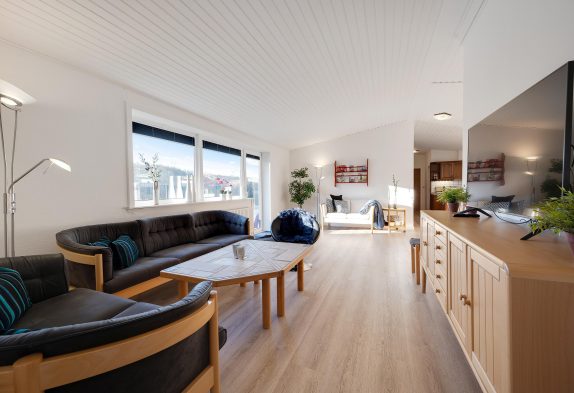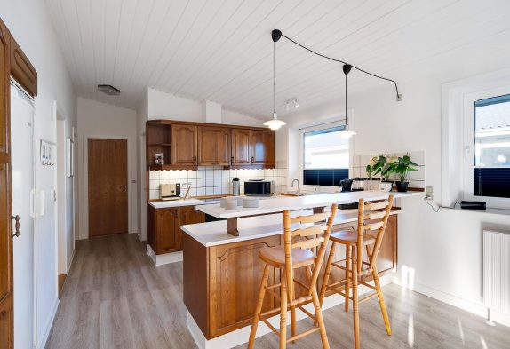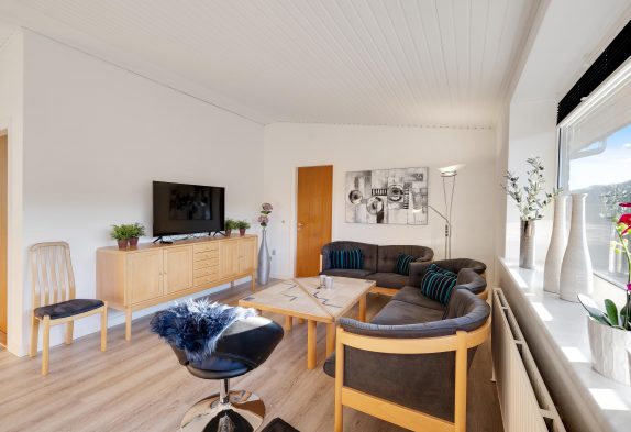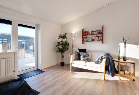 Når I går videre ind i feriehuset, kommer I til køkken-alrummet. Her ligger køkkenet i åben forbindelse med stuen, så børnene kan holdes under opsyn, mens der bliver lavet lækker aftensmad. Stuen er lys og indbydende og her er plads til alle, så I kan have en hyggelig aften sammen med familien. Til tv’et er der Chromecast, så I selv kan sætte jeres yndlingsfilm på direkte fra jeres telefon.