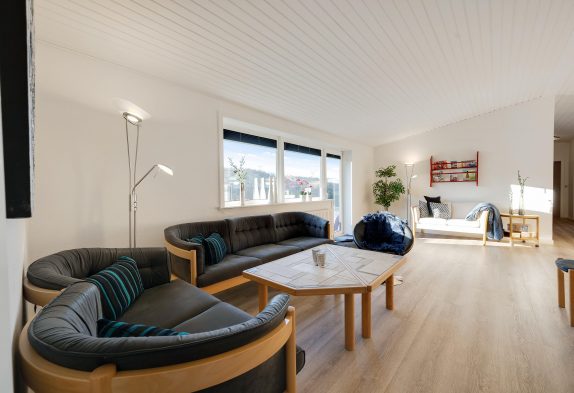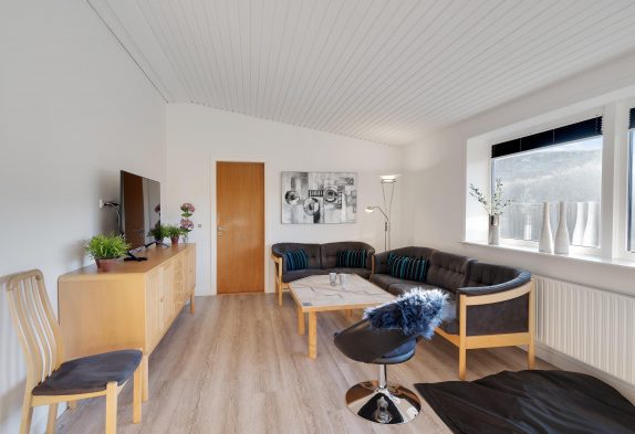Hvis I går ud i den ene garage, finder I et lille opholdsområde med sofa, bordfodbold og tv – perfekt til en sjov og afslappende stund for både børn og voksne.