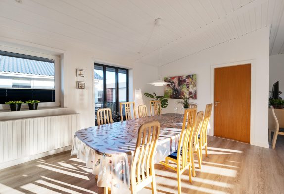 Feriehuset er renoveret i 2021 og har plads til 10 personer. Når I træder ind i feriehuset, kommer I ind i en rummelig entré, hvor der er god plads til hele familiens overtøj og fodtøj. Her finder I også vaskemaskine samt tørretumbler, så jeres tøj kan blive vasket, hvis det er blevet snavset efter en gåtur eller leg med hunden.