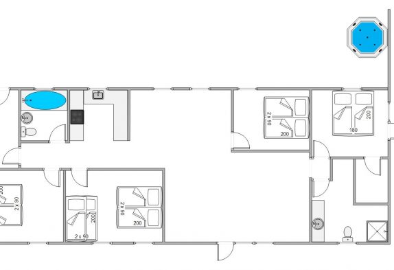 Feriehuset består af i alt 4 soveværelser. Ved entréen finder I de 2 første værelser og ét af de 2 badeværelser. I det ene værelse er der dobbeltseng samt en køjeseng, mens der på det andet værelse er 2 enkeltsenge. Efter en lang dag ved stranden, kan du slappe af i badeværelsets badekar.