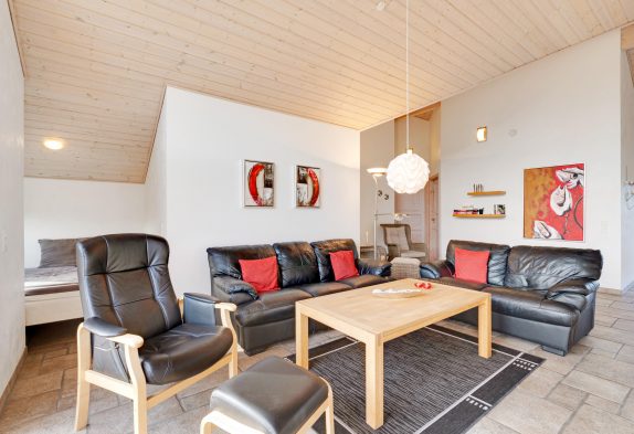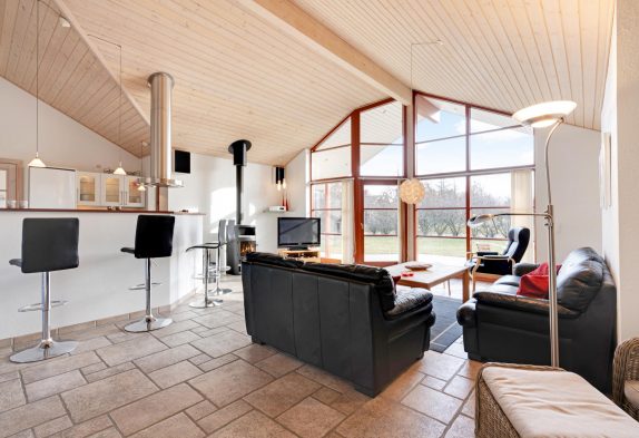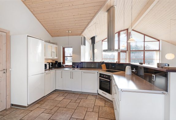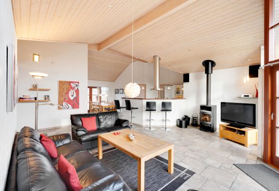 Sommerhuset byder på en åben planløsning, hvor køkken og stue er forbundet og skaber en dejlig rummelig atmosfære. Fra køkkenet kan I nemt holde øje med børnene, som nyder de bløde sofamøbler, mens de streamer deres yndlingsfilm eller serier på sommerhusets Chromecast. I stuen finder I også en hyggelig brændeovn, der er perfekt til afslapning på kølige aftener.