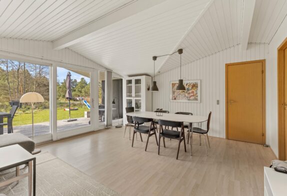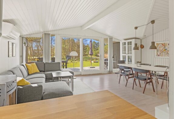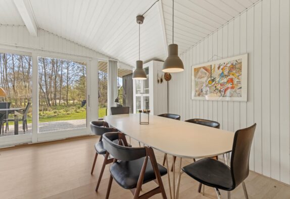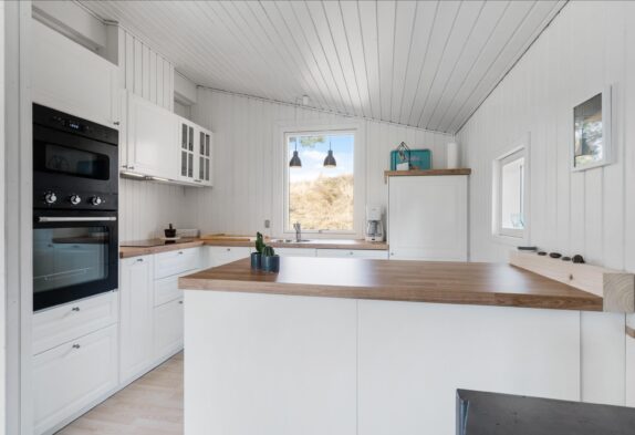 Feriehuset er renoveret i 2020 og er indrettet lyst og venligt. Den store kombinerede køkken-, stue- og spiseafdeling er perfekt til socialt samvær. I kan lave mad samtidig med, at I holder øje med, om der bliver snydt i ”500” nede foran den gode brændeovn.