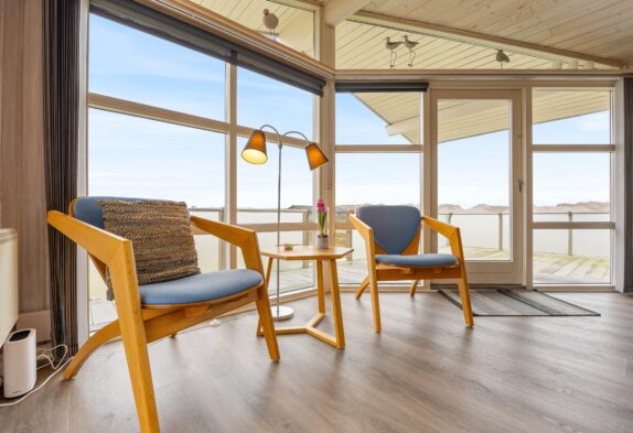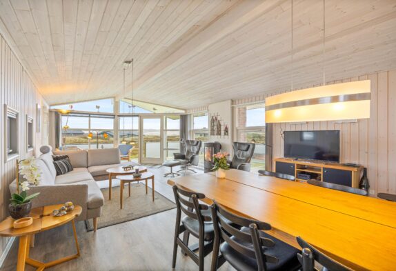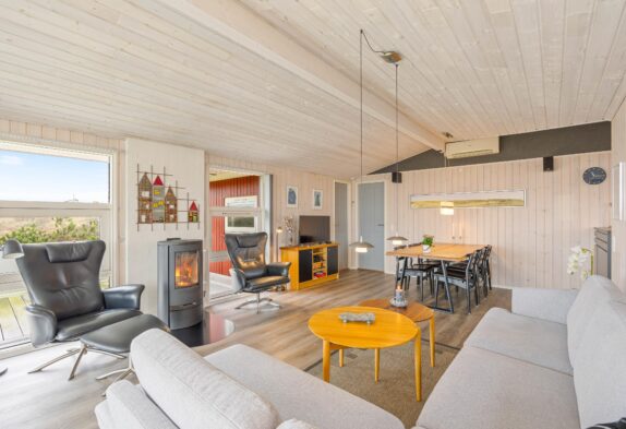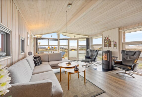 Stor stue med brændeovn og udsigt til klitlandskabet