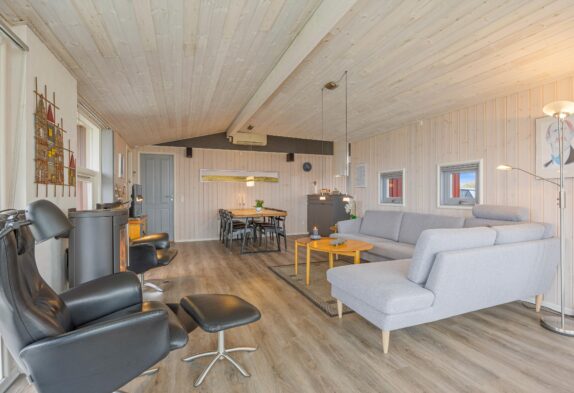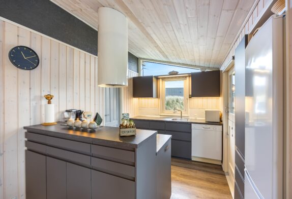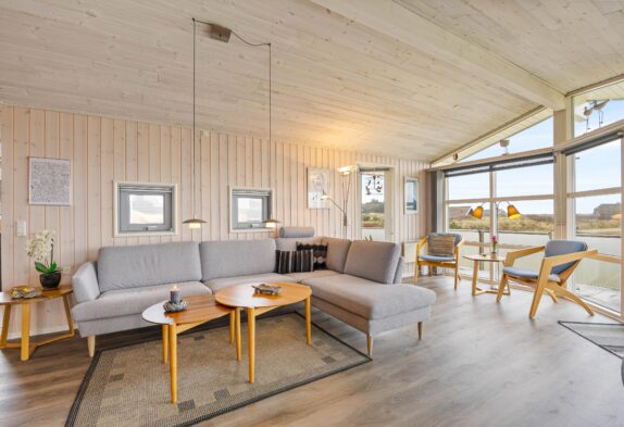 I det 86 m2 store feriehus, som er blevet renoveret i 2021, vil I hurtigt føle jer hjemme i den dejlige stue. Her kan I slappe af på sofaen efter en god dag på stranden, imens I varmer jer på varmen fra brændeovnen. I kan med fordel også bruge den energibesparende varmepumpe til at holde temperaturen i sommerhuset behagelig. Gennem det store vindue i stuen har I en skøn udsigt til klitlandskabet.