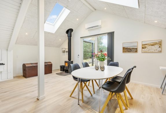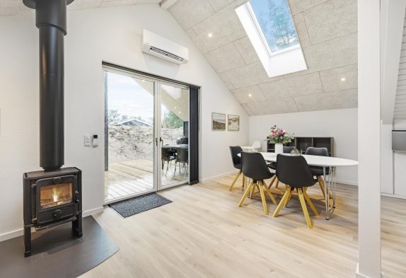 Gnisterne fra stuens brændeovn danner rammerne for en sjov spilleaften eller en hyggelig filmaften med familien, hvor I streamer jeres yndlingsfilm via Chromecasten. Den energibesparende varmepumpe kan med fordel også bruges til at holde temperaturen behagelig. På badeværelset er der gulvvarme.