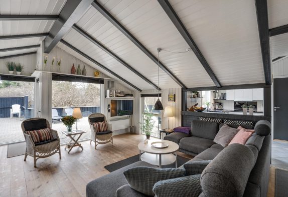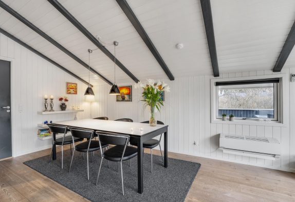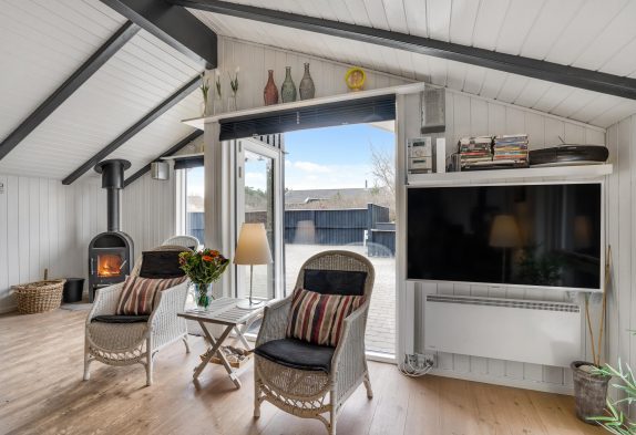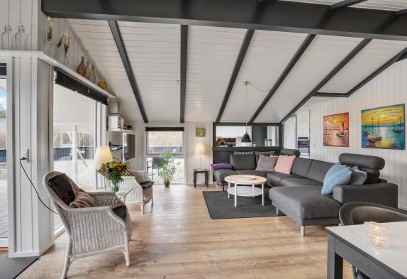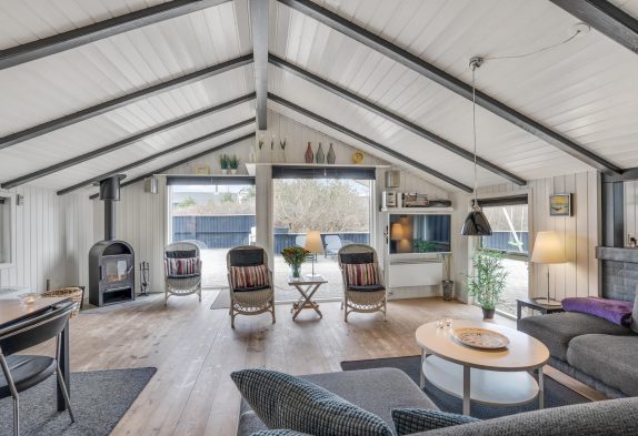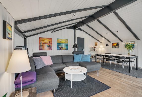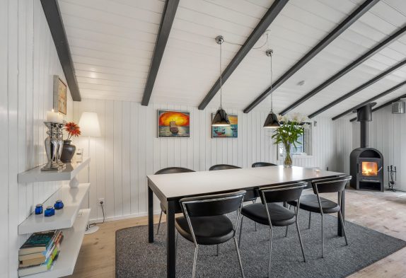Sommerhuset, der er renoveret i 2018, har en lys og indbydende indretning, som I straks vil føle jer hjemme i, når I ankommer på ferieadressen. De synlige bjælker og brændeovnen sætter prikken over i’et for sommerhusstemningen og -følelsen.