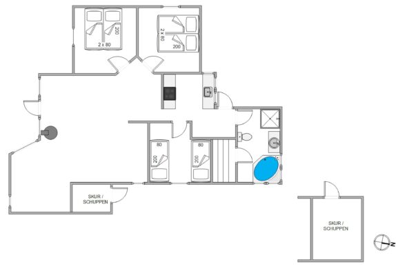 Indenfor vil I blive mødt af en komfortabel og stilfuld indretning, der tilbyder maksimal afslapning. Det moderne badeværelse er udstyret med gulvvarme og en luksuriøs tømmespa og sauna, hvilket giver jer en perfekt mulighed for at forkæle jer selv efter en dag fyldt med aktiviteter.
