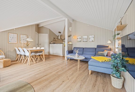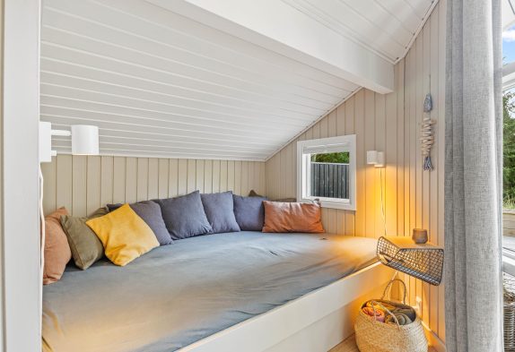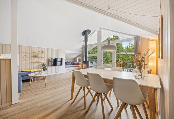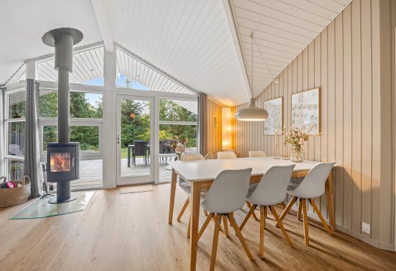 Stuen har en indbydende atmosfære, som skabes af den hyggelige brændeovn, der både sørger for varme og gode betingelser for kvalitetstid med familien. Sommerhuset i Houstrup har fokus på funktionalitet med en opvaskemaskine, vaskemaskine og en energieffektiv luft til luft varmepumpe, der sikrer, at hverdagens logistik går som en leg. I skal blot fokusere på at nyde tiden med hinanden.