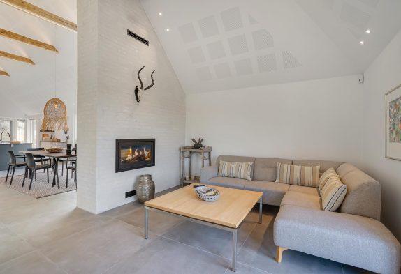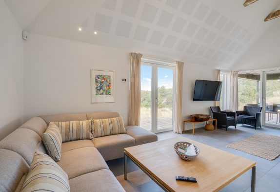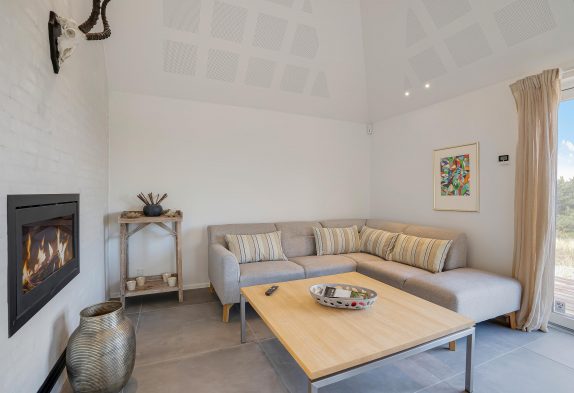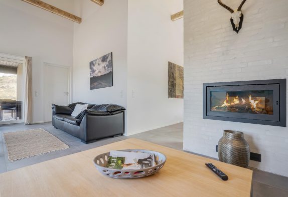 Det store køkken alrum er adskilt fra opholdsrummet via en mur med integreret pejs, der sikrer hygge og varme i begge afdelinger. Atmosfæren i det lyse sommerhus, samt den vidunderlige udsigt ud over det omkringliggende klitlandskab og fyret i Blåvandshuk, er unik. Her kan du tilbringe din uforglemmelige ferie.