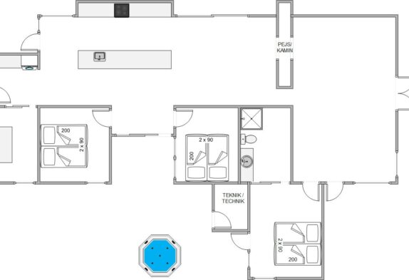 Huset har i alt 6 senge fordelt på 3 soveværelser og 2 gode badeværelser – alle med integreret gulvvarme. Køkkenet er udstyret med alt moderne udstyr, og selvfølgelig er vaskemaskine og tørretumbler også en del af sommerhusets udstyr.