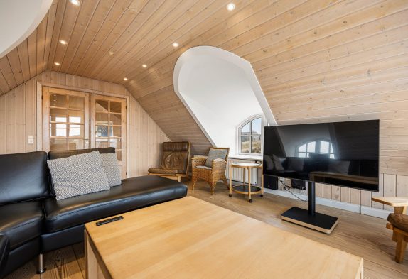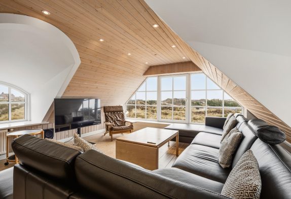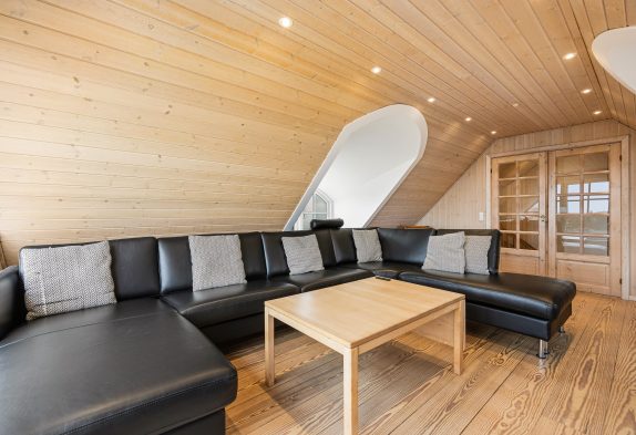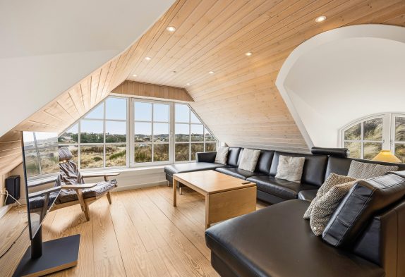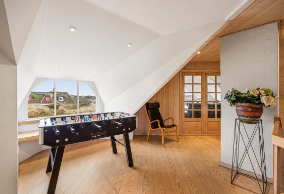 Køkken og spisestue er i åben forbindelse og udgør på den måde ét stort rum, hvor hele familien kan samles omkring fælles madlavning, brætspil eller en god film. Køkkenet er lyst og åbent med god plads til at kokkerere, og i spisestuen kan I nyde hinandens samvær foran den varme brændeovn. På første etage finder I endnu én opholdstue, hvor den smukke udsigt gør rummet helt unikt. Det store vinduesparti sørger både for en fantastisk panoramaudsigt ud over Blåvands natur og ikke mindst et dejligt lysindfald. På første etage finder I også et bordfodboldbord, og det er jo altid sjovt at udfordre hinanden til en omgang bordfodbold.