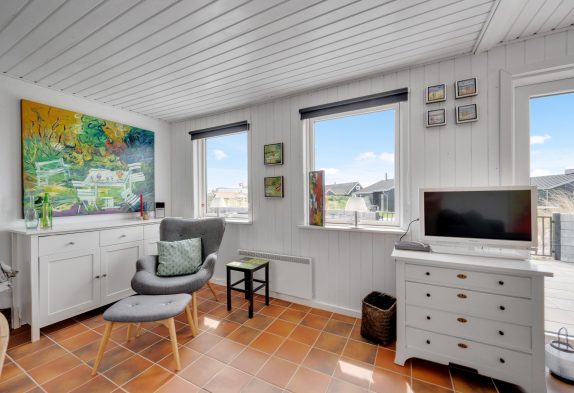 Fra stuen og det ene af feriehusets soveværelser er der udgang til en stor lukket og delvist overdækket terrasse, hvor I kan nyde de gode solskinsdage og den friske, vestjyske luft i fulde drag.
