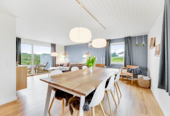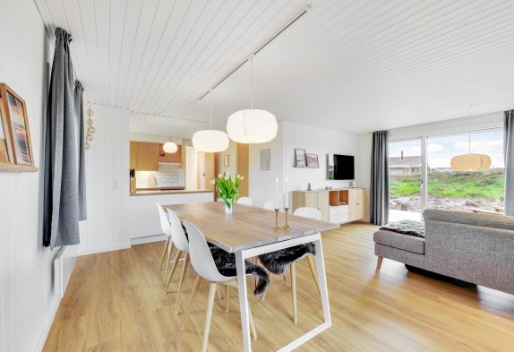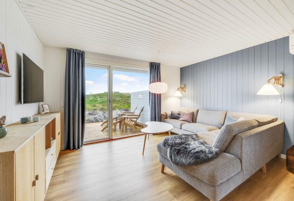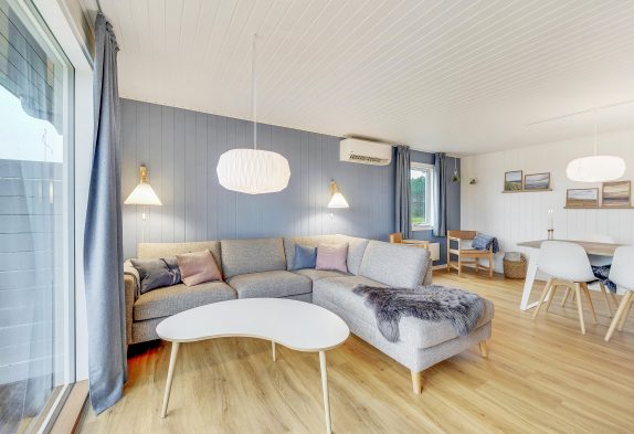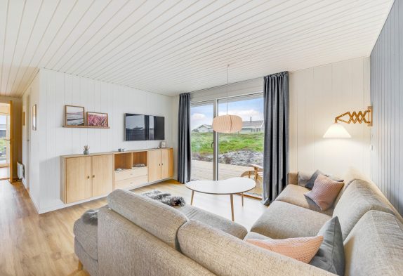 I sommerhuset venter jer en pænt møbleret, moderne stue med et hyggeligt sofahjørne. Her kan I tilbringe mange gode stunder med familien, mens I ser jeres yndlingsfilm, som kan streames via. chromecasten.