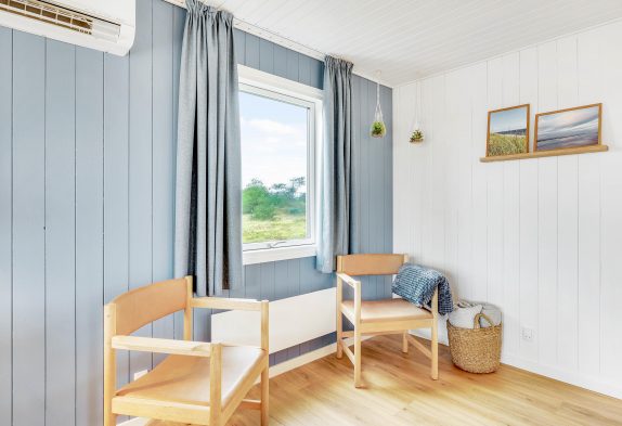 Sommerhuset er udstyret med en varmepumpe, som I med fordel kan bruge til at holde temperaturen i rummet behagelig.