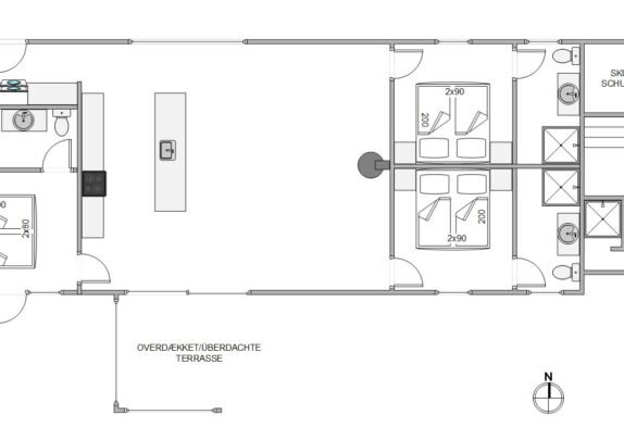 Fra opholdsrummet har I direkte udgang til den store, sydvendte terrasse. Den er lukket og delvist overdækket, så I kan sidde i ly på en regnvejrsdag eller nyde middagssolen på en lun sommerdag. Feriedagene kan nydes i de gode havemøbler og liggestole og gasgrill som I finder på den lækre terrasse, hvor I også kan lave et lækkert grillmåltid.