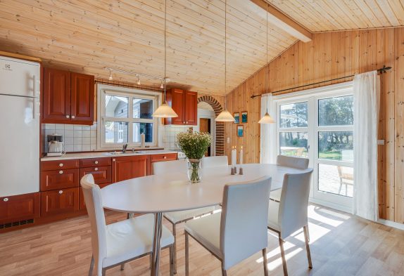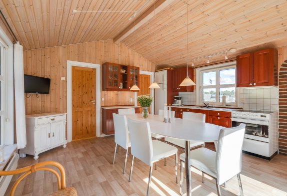 Fra entreen, hvor I kommer ind i huset, kan I gå ud i køkkenalrummet og videre ind i stuen. Her er der plads til gode stunder med dem, du holder af. Brændeovnen giver varme og hyggelig stemning, mens I tager et spil kort. I behøves ikke spille om opvasken, for den klarer husets opvaskemaskine.