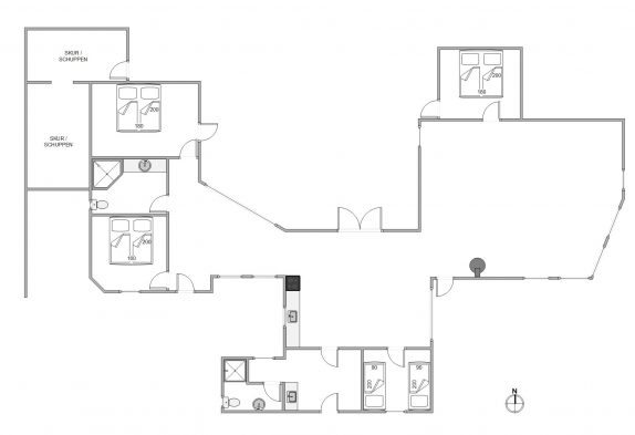 Feriehuset rummer 4 soverum med plads til 6. Der er to badeværelser med gulvvarme i huset og både vaskemaskine og tørretumbler.