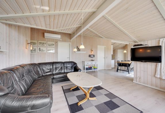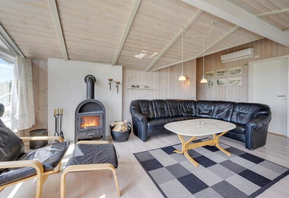 Samlingspunktet i sommerhuset er det rummelige opholdsrum, som ligger i åben forbindelse med køkkenet. Her kan hele familien samles til et spil kort eller en hyggelig filmaften, mens brændeovnen knitrer i baggrunden. I kan også bruge den energibesparende varmepumpe til at holde temperaturen behagelig.