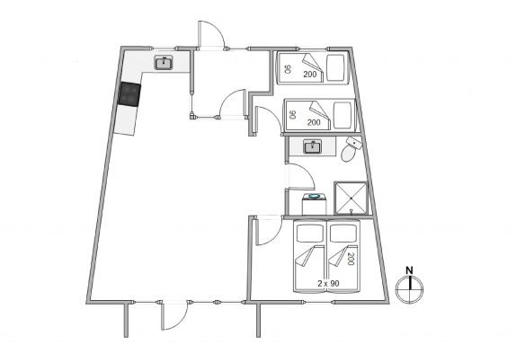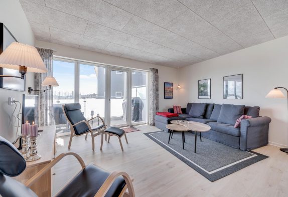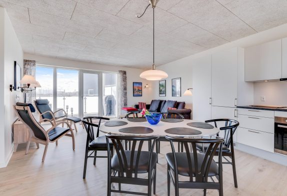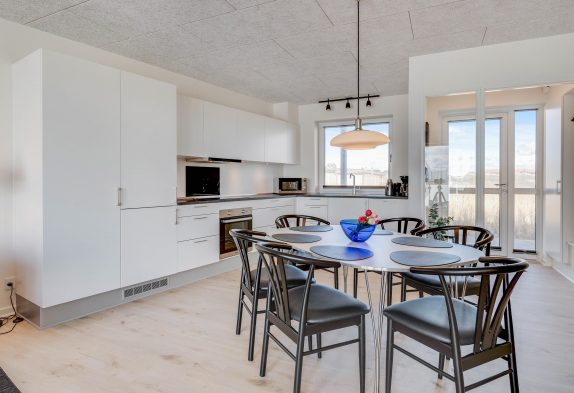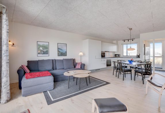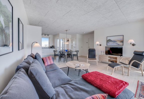 Ferielejligheden rummer plads til op til 6 feriegæster. Fire af sovepladserne finder I i de to soveværelser, mens de sidste to sovepladser udgøres af en sovesofa i stuen. En stilren indretning fungerer som rød tråd gennem samtlige rum i ferieboligen, og alle 87 kvadratmeter er udstyret med gulvvarme. Da lejligheden er opført i 2020 er den isoleriet efter de nyeste standarder, hvilket sikrer en ferielejlighed med begrænset strømforbrug.