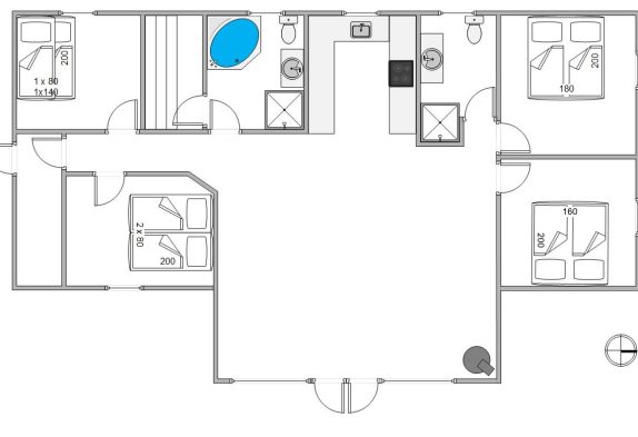 Sommerhusets 8 feriegæster kan fordele sig på de 4 soveværelser, som er indrettet med komfortable senge. Der er 2 dobbeltsenge, 2 enkeltsenge og et værelse med køjeseng – et hit blandt børnene. Feriehuset har desuden 2 badeværelser – begge med gulvvarme -, så der ikke opstår kø om morgenen. På det ene badeværelse er der sauna og spabad, som er rigtig afslappende efter en lang gåtur ved vandet.