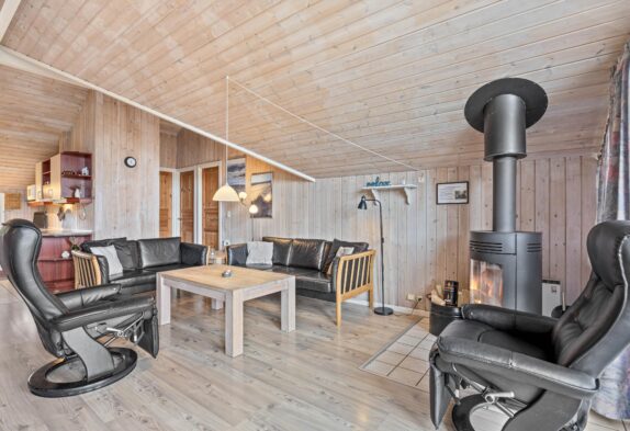 Rummeligt og lyst opholdsrum med brændeovn