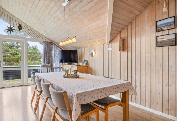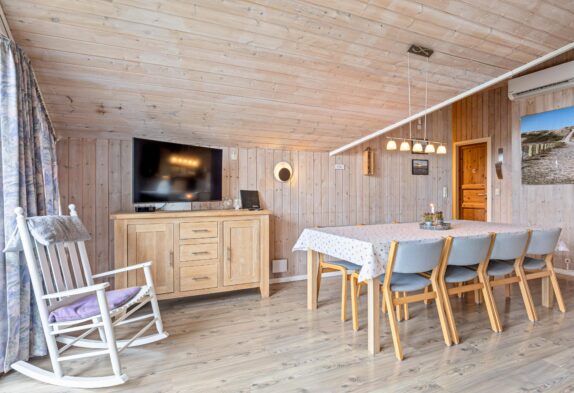 Sommerhuset har et stort opholdsrum med et vestvendt vinduesparti, som gør rummet lyst og indbydende. Stuen er i åben forbindelse med køkkenet, så der er mulighed for at være samlet mest muligt under ferien – også når der laves mad.