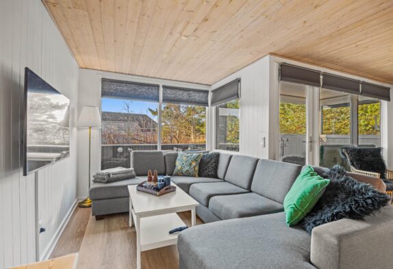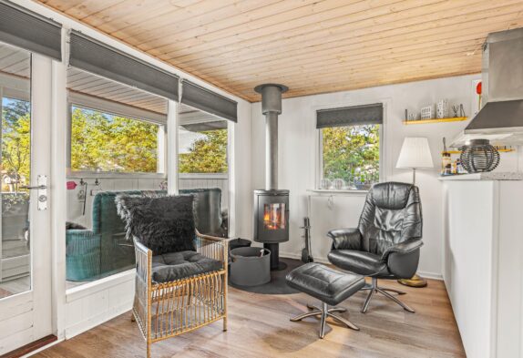 På den store, lukkede terrasse i baghaven finder I gode muligheder for at nyde vejret udenfor. Sommerhuset har grill, havemøbler, solvogne og parasol, så her kan I opholde jer og tilberede de lækreste feriemåltider på grillen. Her finder I også vildmarksbadet, så når mørket falder på, kan I sætte jer til rette i det det store kar og bare slappe af mens I nyder varmen.