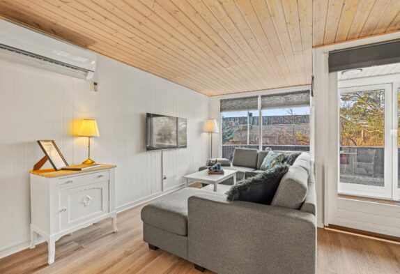 Derudover er der også både vaskemaskine og tørretumbler, så skulle der komme en plet på yndlingstrøjen, kan den være ren igen på kort tid. Badeværelset, der også blev renoveret i 2011, er udstyret med gulvvarme og i den åbne stue og spisestue er en varmepumpe, der sørger for en behagelig temperatur året rundt. Her finder I også brændeovnen, der spreder hygge og varme med sine knitrende flammer.
