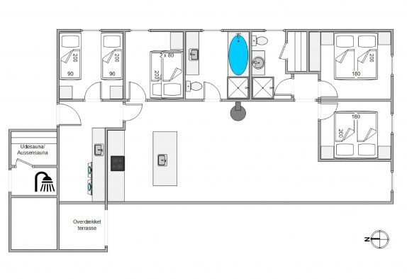 Det er ikke kun indendørs, at feriehuset på Fyrmarken 179 er helt fantastisk; det er udeområdet nemlig også. Her finder I både en udesauna, I kan slappe af i, og en udebruser, hvor I kan skylle sandet af efter en tur ved Vesterhavet, der kun ligger 800 meter væk. I skal dog være opmærksomme på, at udebruseren kun er tilgængelig fra april til november.