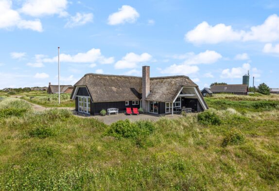 Det charmerende, stråtækte sommerhus på Risbusken 7 har plads til 8 feriegæster, som kan nyde en afslappende ferie i Bjerregård. Sommerhuset er omgivet af en stor terrasse, hvorfra I kan nyde udsigten til det smukke klitområde. Har I brug for velvære og afslapning efter en tur til stranden, venter en varm sauna og en boblende spa på det ene af feriehusets 2 badeværelser. Har I hund, er den også hjertelig velkommen i sommerhuset.