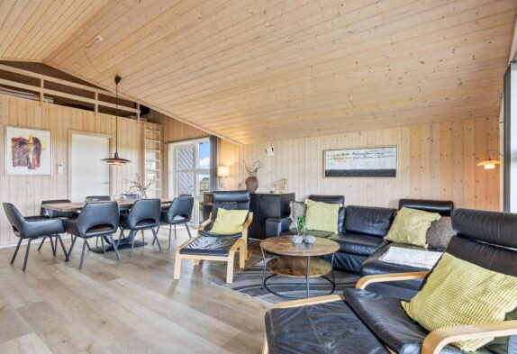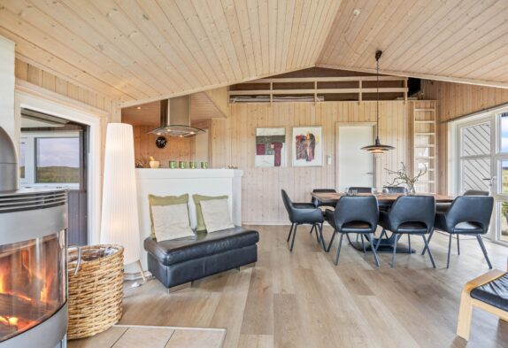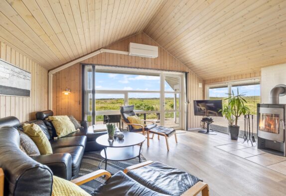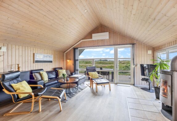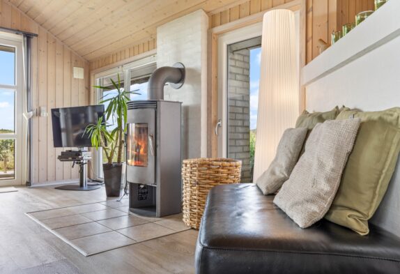 Sommerhusets hjerte er det store opholdsrum, hvor der er plads til hele familien. Her kan I samles til et spil kort eller en hyggelig aften på sofaen, mens brændeovnen knitrer i baggrunden og spreder både varme og ekstra feriestemning. I kan også benytte jer af den energibesparende varmepumpe til at holde temperaturen i rummet behagelig.