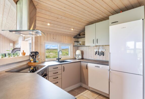 Her er loft til kip og de store vinduespartier skaber et godt lysindfald, så rummet fremstår særdeles lyst og indbydende. Desuden har I en skøn udsigt til klitområdet, som ligger lige i baghaven til klitgrunden.