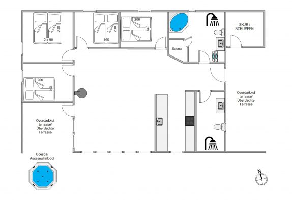 Er I udendørs, kan I sætte jer til rette i udespaen. Her kan I læne jer tilbage og nyde selvforkælelsen for fulde drøn under åben himmel. Gør jer selv den tjeneste at opleve det under aftenens stjernehimmel – dét er virkelig en oplevelse. Udover udespaen finder I også en udebruser på terrassen, som er tilgængelig fra april til november. Her kan I skylle jer under efter en tur ved Vesterhavet, der ligger kun 600 meter væk. Efterfølgende kan I sætte jer ind i saunaen, hvor I kan blive varmet godt igennem.