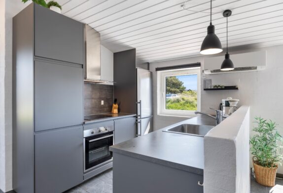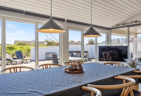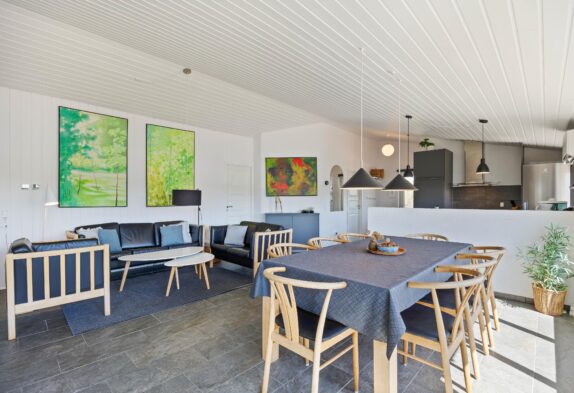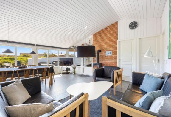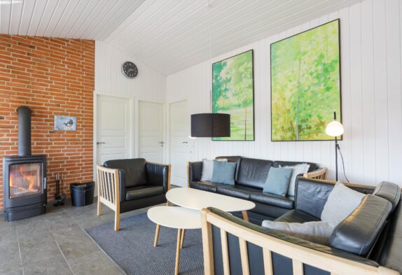 Hjertet i feriehuset er alrummet, hvor køkken, stue og spiseafdeling er samlet. Mens de voksne sørger for madlavningen i køkkenet, kan børnene hygge sig i sofaerne. Om aftenen kan I streame jeres yndlingsfilm på tv’et via Chromecasten. For at fuldende den hyggelige feriestemning kan I tænde op i brændeovnen. Udenfor i redskabsrummet er desuden en ekstra fryser på 100 L.