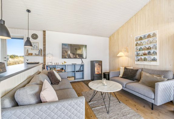 I åben forbindelse med det veludstyrede køkken ligger den hyggelige stue, hvor familien kan nyde hinandens selskab, læse en god bog og drikke en kop kaffe, mens brændeovnen knitrer i baggrunden.