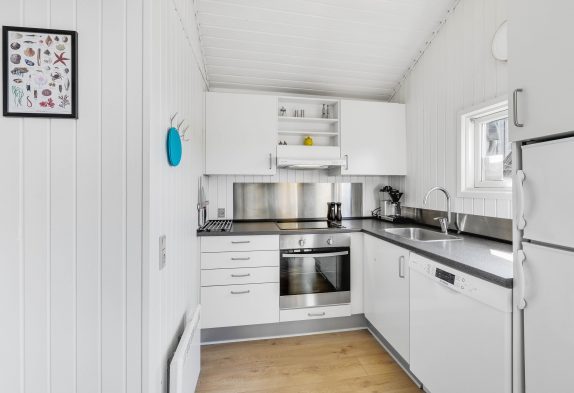 I direkte forbindelse med stuen ligger det veludstyrede køkken, hvor der kan tilberedes lækre måltider. Efter madlavningen hjælper opvaskemaskinen jer med opvasken.
