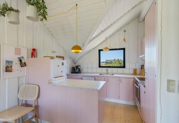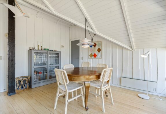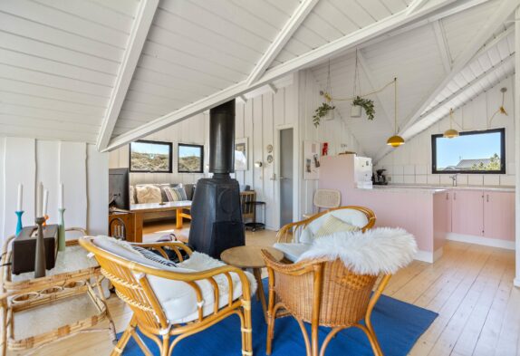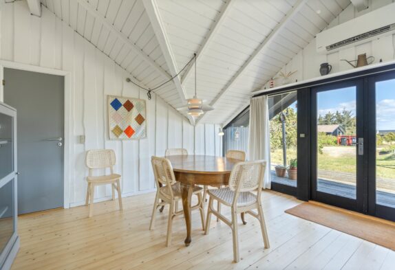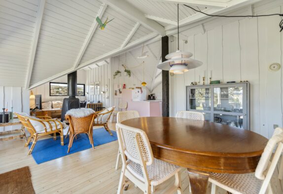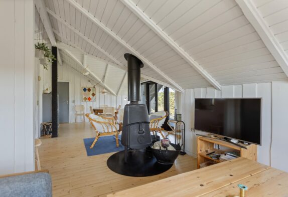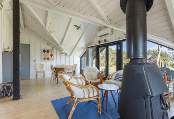 Samlingspunktet i feriehuset finder I i det hyggelige opholdsrum. Opholdsrummet ligger i åben forbindelse med sommerhusets køkken, så familien kan være samlet mest muligt under ferien. Stuen er indrettet med en brændeovn, som spreder varme og en ekstra hyggelig feriestemning. Sommerhuset har desuden en varmepumpe, som I med fordel kan benytte jer af.