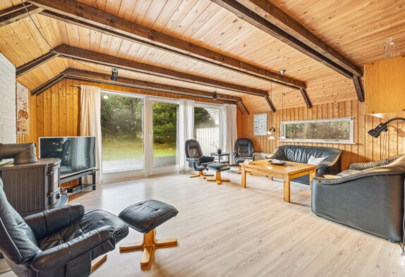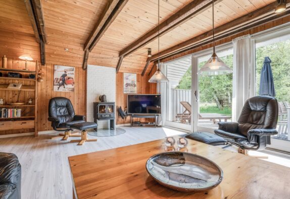 Køkkenet er selvfølgelig udstyret med opvaskemaskine, som klarer den værste opvask for jer. I stuen kan I se jeres yndlingsfilm på sommerhusets fladskærms-tv, mens I varmer jer foran brændeovnen. Sommerhusets 6 sovepladser fordeler sig på 4 soveværelser – 3 med dobbeltseng og 1 værelse med en etageseng. Yderligere har sommerhuset et badeværelse med gulvvarme. På første sal har I desuden en god udsigt ud over den smukke natur, som omgiver sommerhuset. Alle sommerhusets rum er lyse og indrettet med træbjælker både på loft og vægge, som skaber den helt rigtige atmosfære.