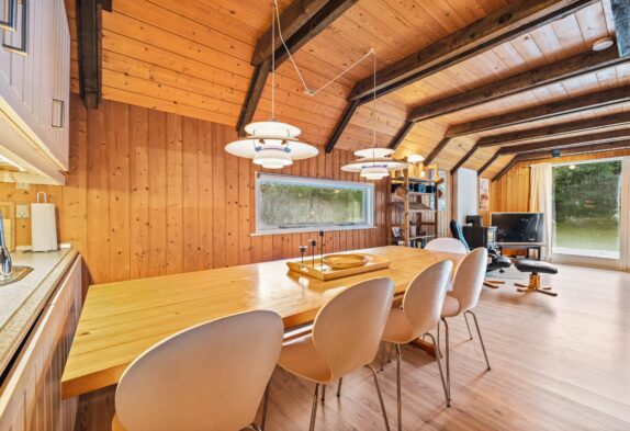 Sommerhusets rustikke indretning og de skønne omgivelser skaber gode rammer for jeres ferie. Køkken og stue er i åben forbindelse og udgør på den måde ét stort rum, hvor hele familien kan samles og nyde godt samvær.