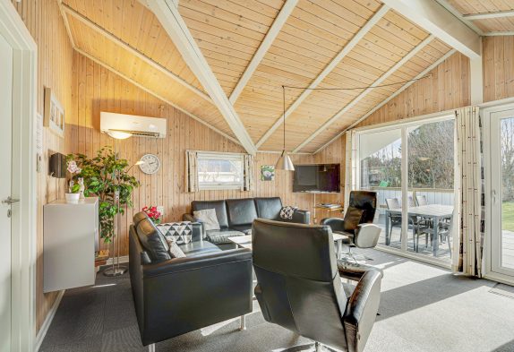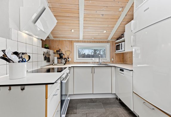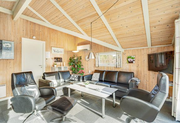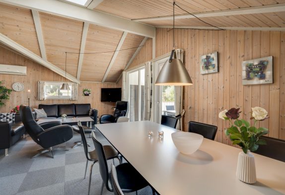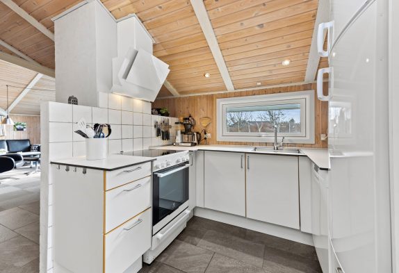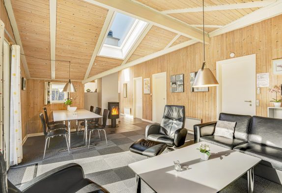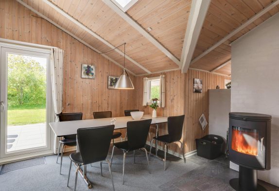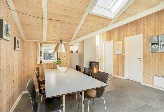Sommerhuset har en dejlig indretning med loft-til-kip, hvor I med det samme kommer i sommerhusstemning. Der er også to ovenlysvinduer i stuen, som sørger for et dejligt lysindfald. Feriehuset er løbende renoveret med nye bordplader, gulv i værelse, senge mv. Stue, spisestue og køkken er i åben forbindelse, og skaber på den måde ét stort rum, hvor hele familien kan samles. I kan derfor nyde hinandens nærvær, hvad end I laver mad, spiller spil eller ser en film via sommerhusets chromecast. Desuden er der i stuen en brændeovn, som skaber den helt rigtige sommerhusatmosfære, så I kan nyde jeres aftener i sofaerne med brændeovnens knitren i baggrunden.
