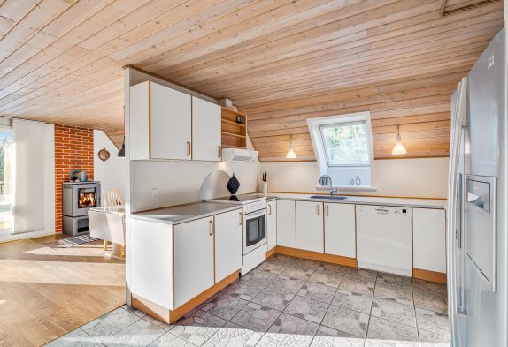 Køkkenet er udstyret med en opvaskemaskine, som nemt klarer opvasken efter hvert måltid i godt selskab. Huset rummer også et gæstetoilet og et badeværelse. Badeværelset har både varm gulvvarme og en tømmespa til de kolde og lange dage, hvor kroppen skal varmes lidt ekstra.